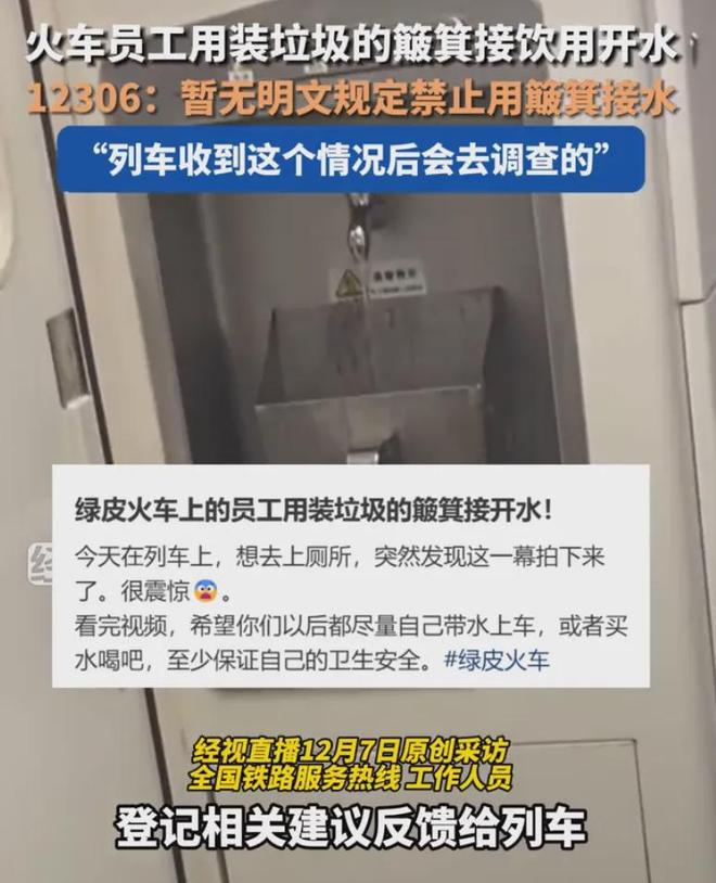 据经济观察网现场报道,近日,一位IP地址为广西的网友称,他在绿色列车上看到工作人员用装满垃圾的簸箕收集开水,引起广泛关注。 12306铁路热线已记录反馈情况,并将研究改进。律师指出,这种做法存在健康风险,如果给乘客带来健康问题,铁路部门应承担责任。记者尝试联系该发帖者,但未得到回复。记者拨打了国家铁路服务热线。工作人员表示,目前还没有明确规定禁止使用簸箕接开水。 “目前还没有明确的规定规定你可以使用哪个簸箕来盛水并取水。”针对旅客反映的卫生问题,工作人员回应:“我们会根据相关建议反馈给列车。列车收货情况“我们稍后会进行调查,我们也会及时收集旅客建议,及时修改铁路规定。”对此,湖北省律师协会交通运输管理专业委员会秘书长吴鹏飞表示,直接使用垃圾容器饮用饮用水,很容易造成直饮水二次污染,影响旅客健康。吴鹏飞强调,如果因此导致旅客出现腹泻等病症,铁路应承担相应的赔偿责任。 (来源:经济电视台直播)